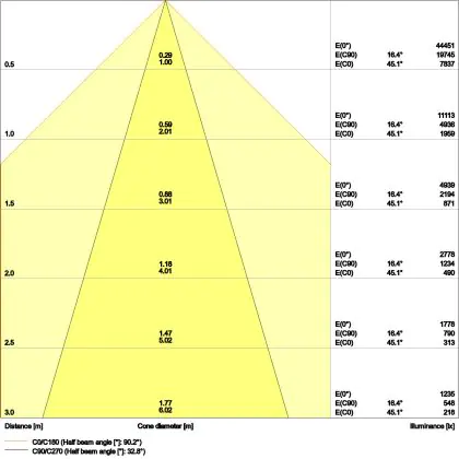 De gradenbundel geeft informatie over hoe breed het licht wordt uitgestraald. Dit zit tussen de 0 en 360 graden (D). Hoe kleiner de hoek, hoe specifieker de lichtbundel is. Over het algemeen is een smalle gradenbundel perfect voor sfeer- of accentverlichting, terwijl een brede gradenbundel ideaal is om grote oppervlaktes te verlichten.
