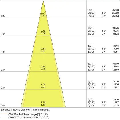 De gradenbundel geeft informatie over hoe breed het licht wordt uitgestraald. Dit zit tussen de 0 en 360 graden (D). Hoe kleiner de hoek, hoe specifieker de lichtbundel is. Over het algemeen is een smalle gradenbundel perfect voor sfeer- of accentverlichting, terwijl een brede gradenbundel ideaal is om grote oppervlaktes te verlichten.