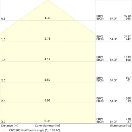 De lichtopbrengst (Lumen), geeft weer hoe krachtig het uitgestraalde licht is. Dit is belangrijk om te weten om de juiste sfeer te creëren. 0 tot 400 Lumen is bij uitstek geschikt voor accent- of sfeerverlichting. Een hoger aantal Lumen is, afhankelijk van de grootte van de ruimte, beter geschikt als ondersteunende- of basisverlichting. Heb je plafonds hoger dan 4 meter, dan is een lichtopbrengst van minimaal 8000lm aan te raden indien heldere verliching gewenst is (vb. in werkomgevingen).